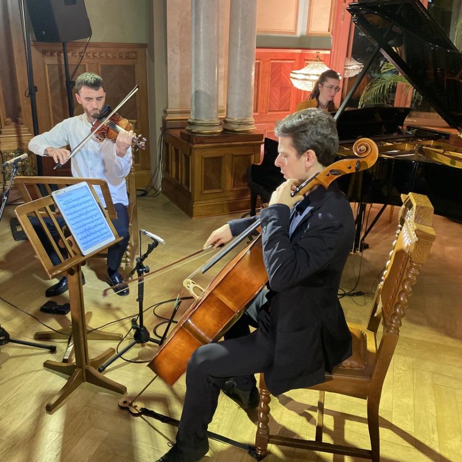 W sobotę (23 listopada) w Willi Lentza odbył się kolejny koncert organizowany w ramach cyklu prezentującego wszystkie dzieła najwybitniejszego polskiego kompozytora i pianisty. Tym razem francuscy muzycy z PAVONE ENSEMBLE (skrzypek Elie Hackel, wiolonczelista Thibaut Reznicek oraz pianistka Sarah Zajtmann), przedstawili wybrane pieśni Fryderyka Chopina oraz Jego utwory kameralne na skrzypce, wiolonczelę i fortepian.
